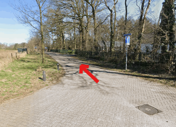 Rij daarna, zoals te zien op de foto, rechtdoor de doodlopende weg in tot je ons logo ziet.